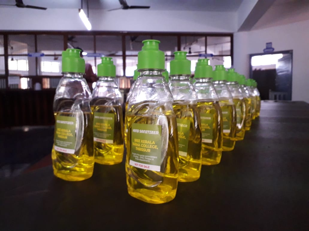 - Sree Kerala Varma Collge on fight against Corona in April 2020. College principal and other staff members on distribution of hand sanitizer made at the Chemistry Lab in the premises of the college. Click here for image1, image2.