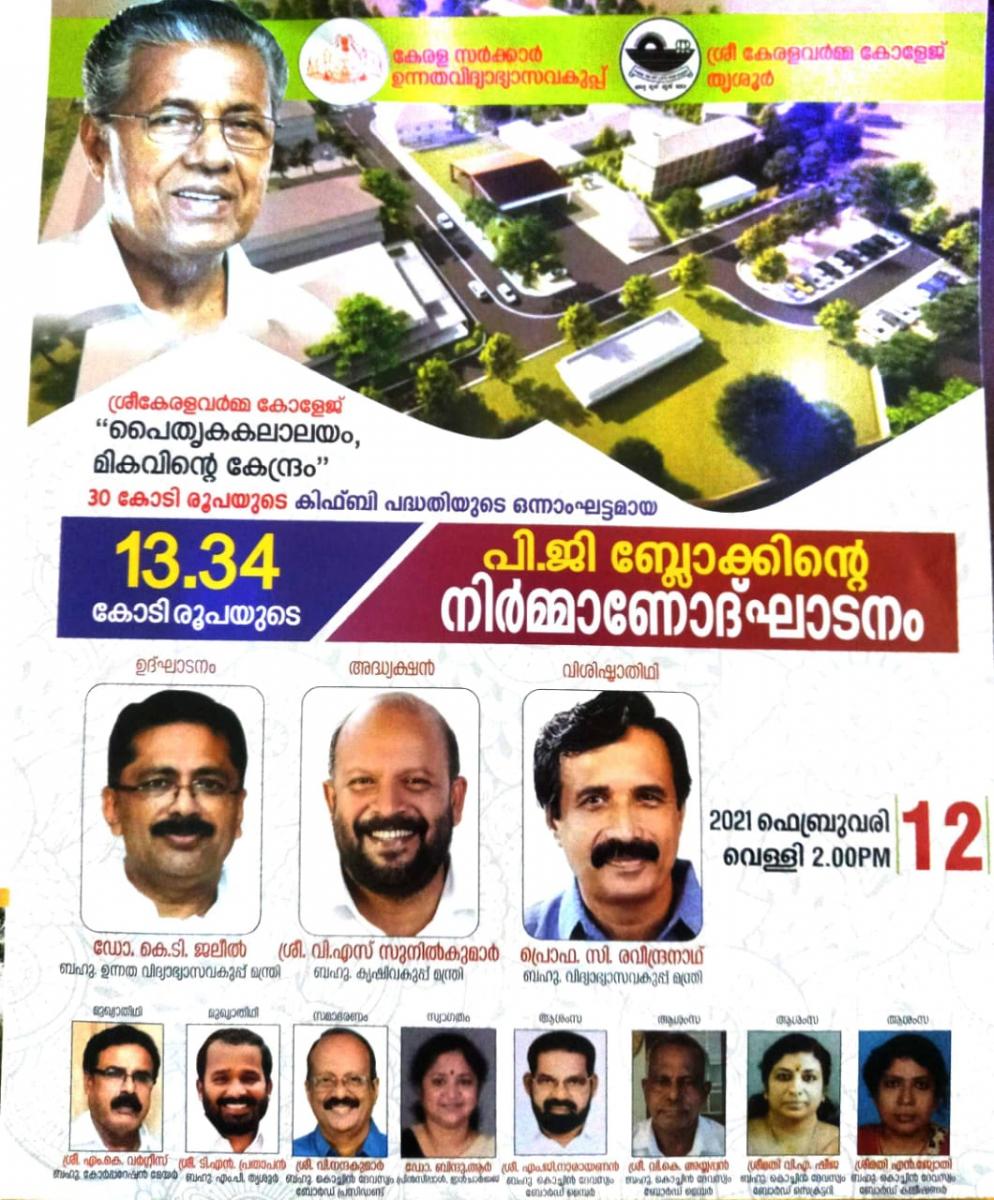 - Inauguration of the KIIFB project of Construction of New PG Block by Hon Minister of Higher Education Dr K T Jaleel, Chief Guest Hon Minister of Education Prof C Raveendranath and Precided by Hon Minister of Agriculture Sri V S Sunilkumar. For Images, click Image 1, click Image 2. For Brochure click here.