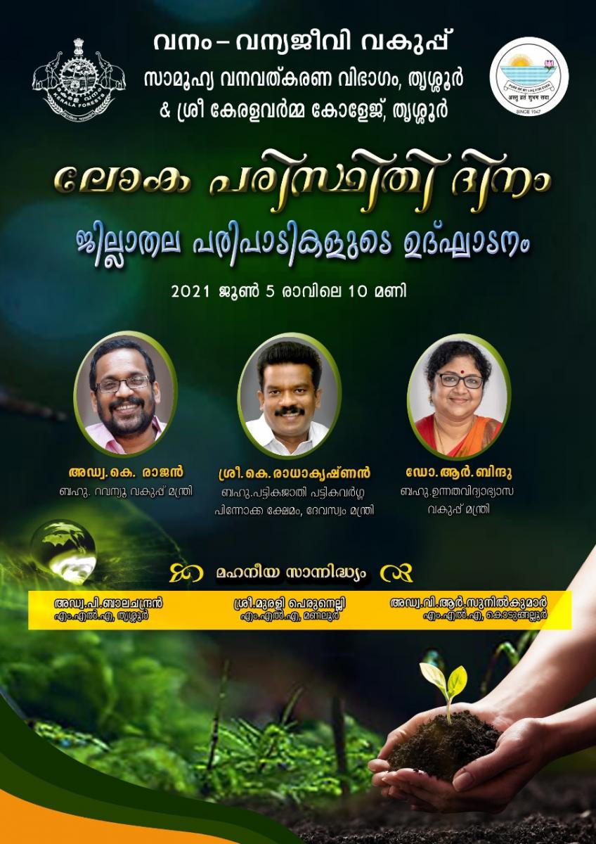- ലോക പരിസ്ഥിതി ദിനം - വനം വന്യജീവി വകുപ്പ് - ജില്ലാതല പരിപാടികളുടെ ഉദ്ഘാടനം ജൂൺ 5 നു തൃശൂർ ശ്രീ കേരള വർമ്മ കോളേജിൽ. ബ്രോഷർ കാണാൻ ക്ലിക്ക് ചെയ്യുക.