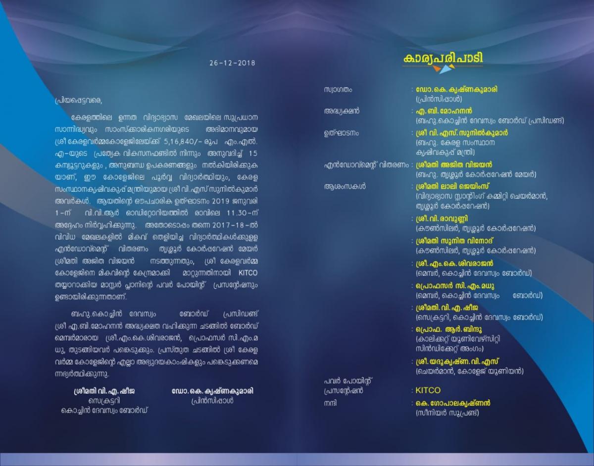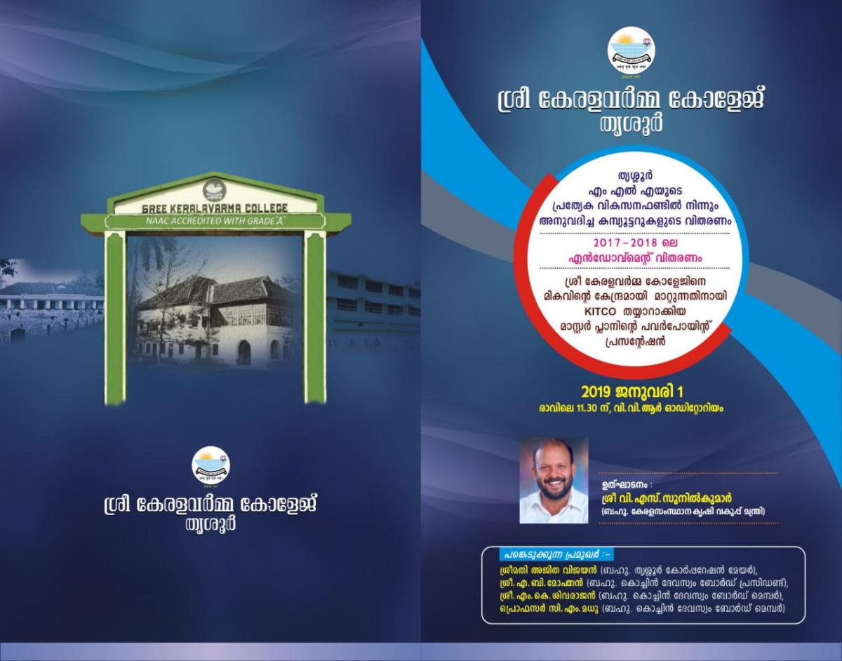 - Hon. Minister Sri V S Sunil Kumar inaugurated the distribution of Computers allotted from Thrissur MLA special development fund to Sree Kerala Varma College Thrissur on 1 January 2019. Brochure page 1, page 2.