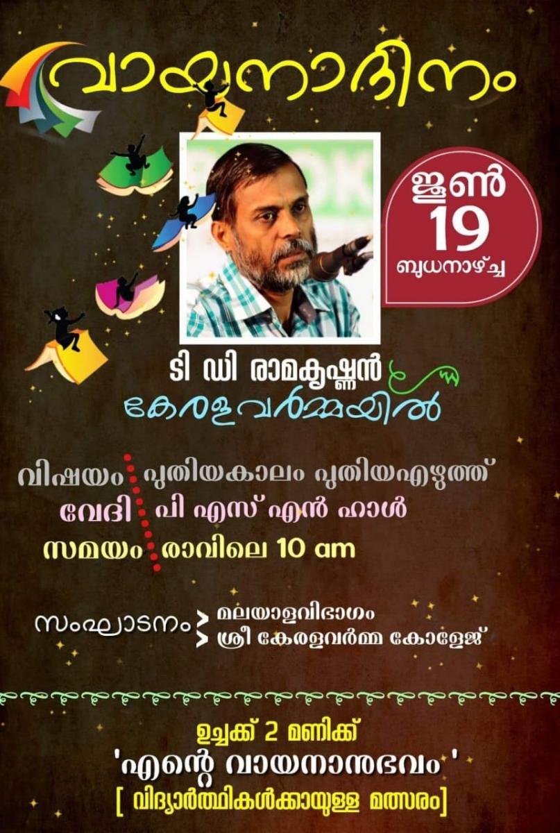 - Department of Malayalam observe "Vayanadinam" on 19 June 2019.